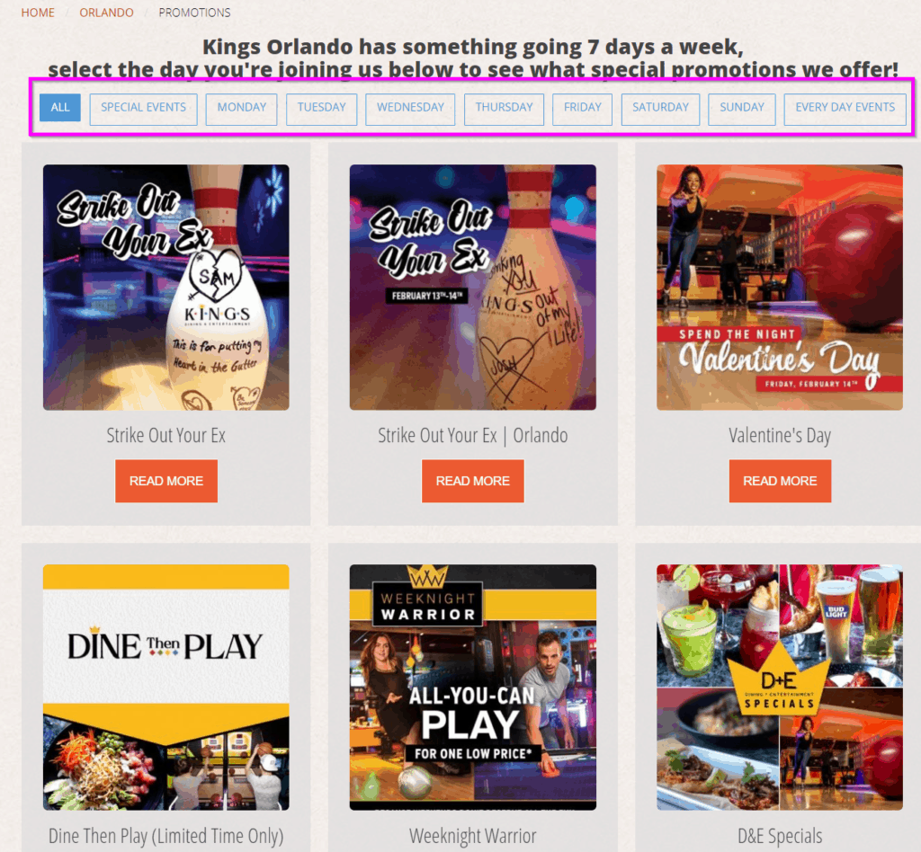 Your customers could choose to cook at home, and when most people want a restaurant to dine at, they are selecting a location based on entertainment and not just food served. This means that you should highlight upcoming events on your homepage and other pages to show the value that your restaurant offers patrons.
